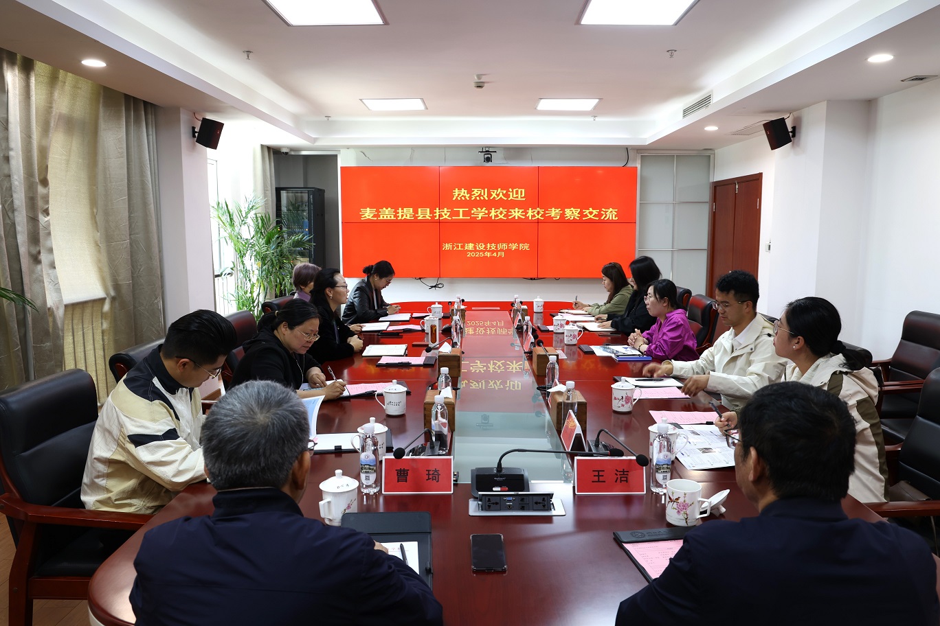 4月14日,新疆维吾尔自治区麦盖提县技工学校党支部书记、校长陈敏凤,纪检委员、校长助理兼教务室主任褚延澄一行来校考察交流。学院院长毛文娟及教务部、建筑工程系、经济管理系、安装工程系、团委相关负责人参加座谈。