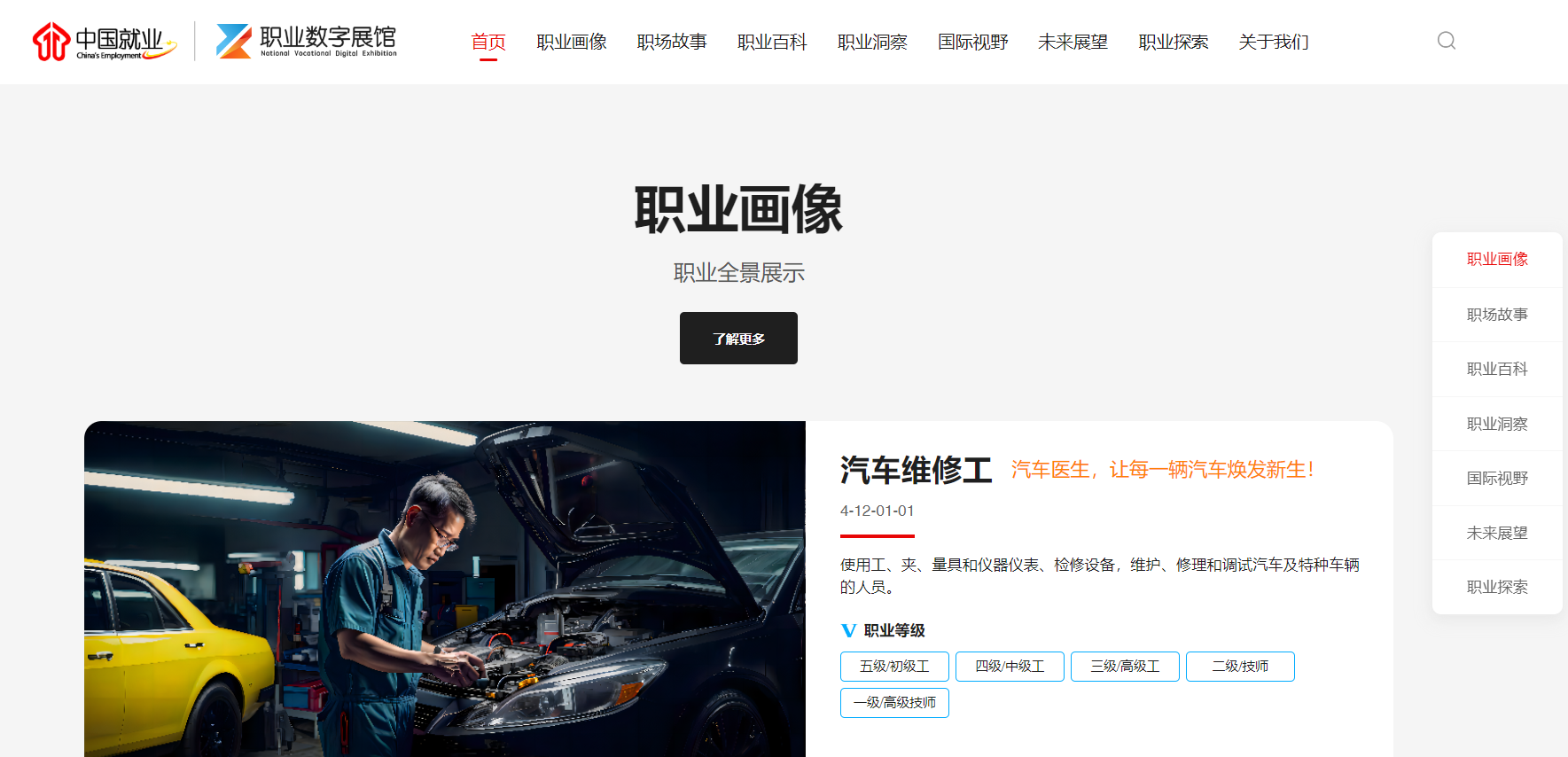 为贯彻落实党的二十大和二十届二中、三中全会精神,深入贯彻党中央、国务院关于促进高质量充分就业的决策部署,着力提升公众职业认知,开发新的就业增长点,近期,由人力资源社会保障部中国就业培训技术指导中心开发的“职业数字展馆”正式上线。该展馆依托《中华人民共和国职业分类大典》(2022年版)和国家职业标准,以数字化方式创建职业数字画像,全面展示职业信息,致力构建打造素材多元、内容丰富、展示生动的职业云端百科全书。