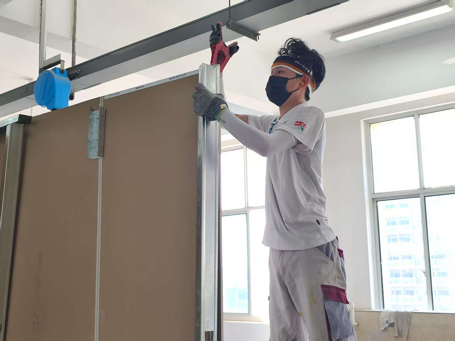 竞赛现场氛围紧张热烈,选手们全神贯注,手中的工具在建材间灵活穿梭。在隔墙系统建造模块,他们精准测量、细心组装骨架,确保结构的稳固与规范;隔声处理环节,对隔音材料的铺设与密封处理一丝不苟;石膏板表面处理和抹灰过程中,力求墙面平整光滑、阴阳角线条笔直;装饰线条制作安装时,精心雕琢造型,展现出精湛的工艺水准。