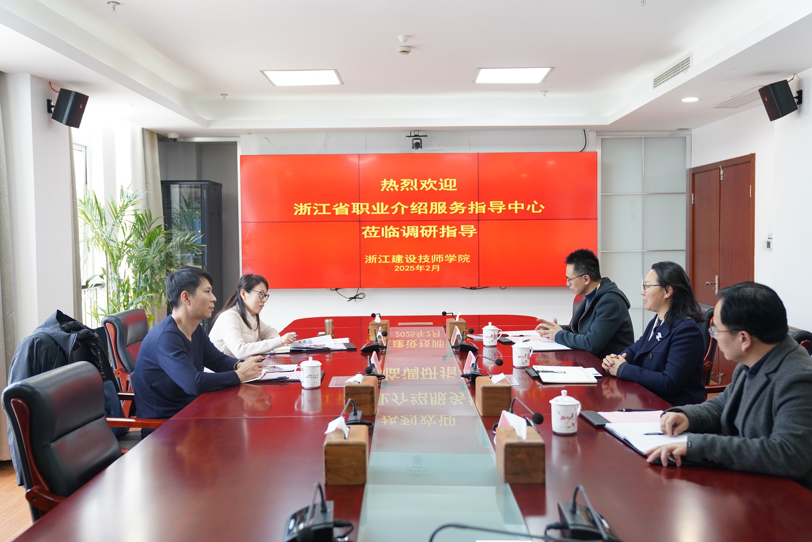 2月26日,浙江省职业介绍就业服务指导中心主任王栋、职介代理科科长邵茵来校调研指导。学院院长毛文娟、副院长张国华及招生就业部负责人参加座谈。