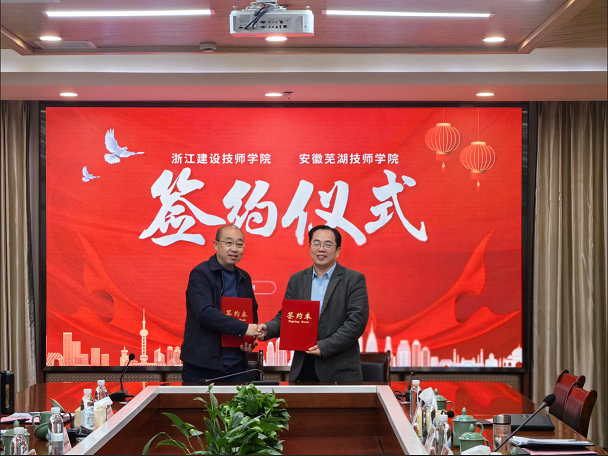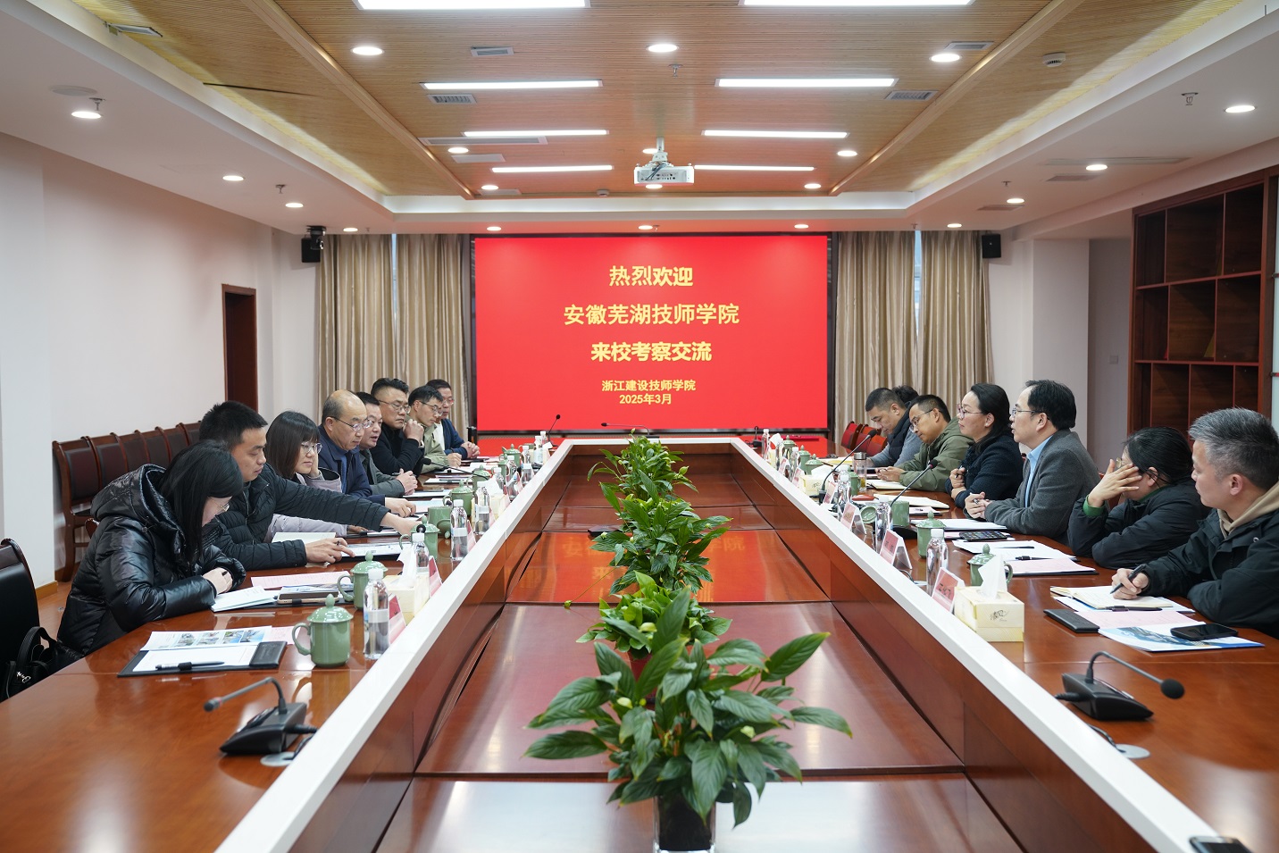 3月5日,安徽芜湖技师学院颜宏滨副院长一行来校考察交流,并签署校校合作协议。学院院长毛文娟、副院长张国华及建筑工程系、经济管理系、世赛中心等部门负责人参加座谈。