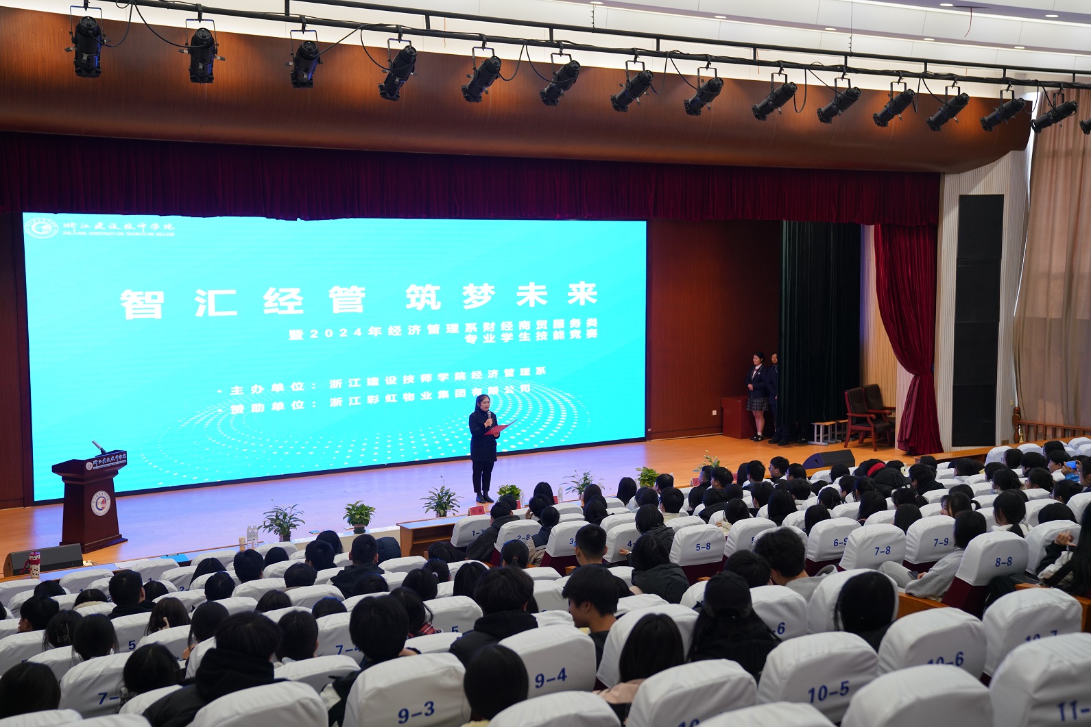 12月17日,一场旨在弘扬学校精神、传承会计文化、激发学生潜能的盛会——“智汇经管,筑梦未来” 经济管理系财经商贸服务类专业学生技能竞赛周开幕式在学院报告厅举行。彩虹物业集团人事经理戴春雷、学院副院长张国华出席,经济管理系师生代表参加。