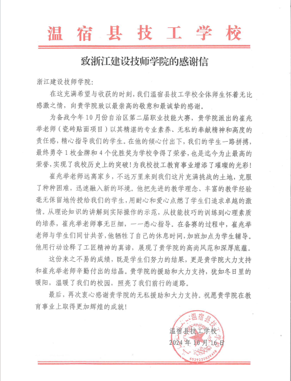 近日,学院收到一封来自新疆阿克苏温宿县技工学校的感谢信,感谢学院世赛冠军、特级技师崔兆举远赴温宿县技工学校,为参加新疆维吾尔自治区第二届职业技能大赛的选手做赛前指导,帮助他们实现技能水平的再提升,并在大赛中获得瓷砖贴面项目11优胜。