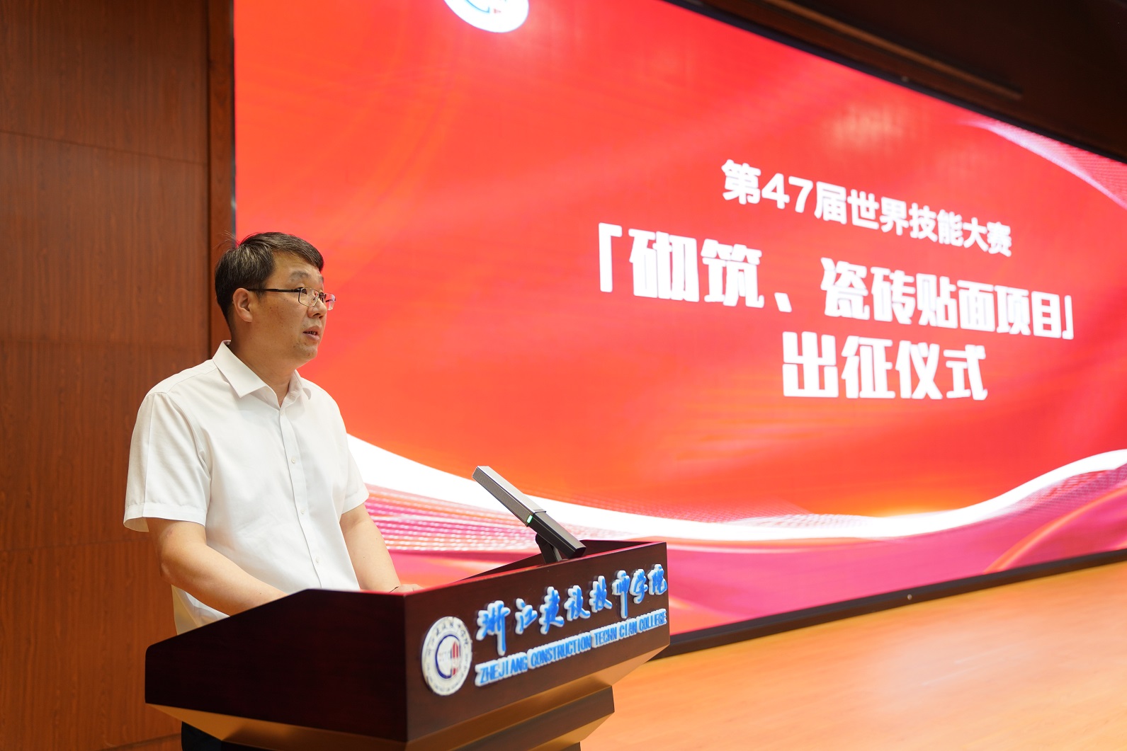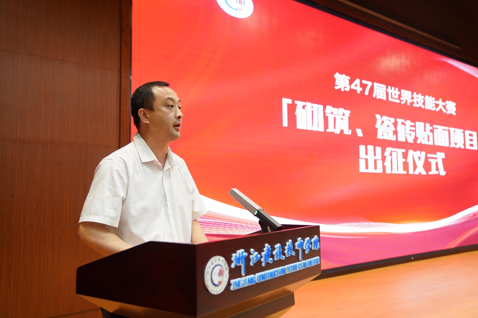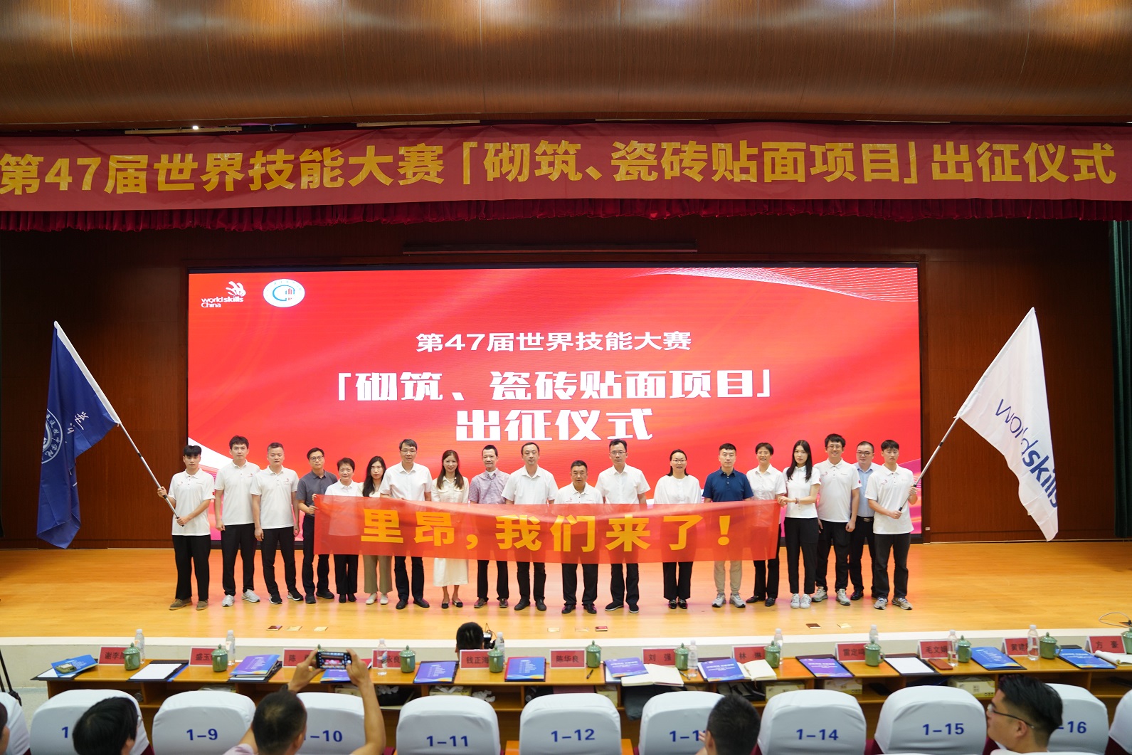 战鼓声声催奋进,旌旗猎猎踏征程。8月29日上午,浙江建设技师学院报告厅内“战鼓擂动”,为即将代表我国出征第47届世界技能大赛的砌筑、瓷砖贴面两个项目的选手和专家教练团队加油鼓劲,激励选手们再接再厉、坚定信念。浙江省机电集团副总经理刘强,浙江省人社厅职业能力建设处处长陈华良、副处长林琳,学院世赛十年征程的开拓者和领航人、学院领导钱正海,学院两级领导班子成员出席活动。学院世赛专家组成员、选手、师生代表参加活动。