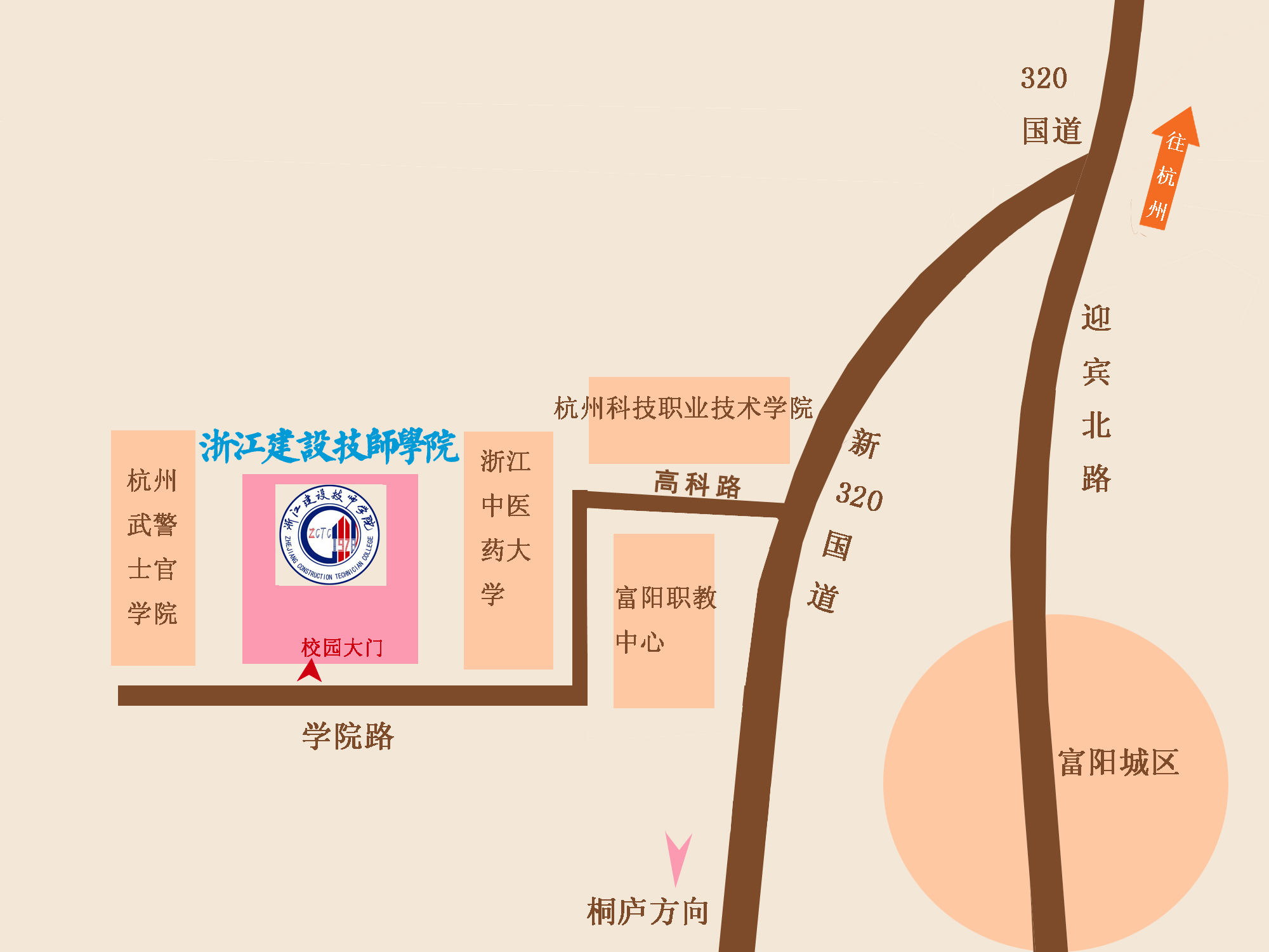 2.从杭州市区出发:可走中河高架转至彩虹快速路(或走之江路)或由城西走紫之隧道,然后转至320国道行至受降镇,见路标“衢州、新登、场口方向”转至新320国道行6公里,见路标“高教园区、浙江中医药大学富春校区”驶入高科路即可到达学校。