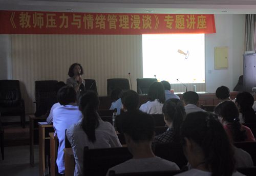 本次讲座中,邢静南教授不再以理论式的内容讲述为主,而是凸显互动式的体验和交流,通过一系列心理学中著名的压力检测图片、互动游戏等活动,让聆听讲座的教职工快速进入状态,现场气氛愉悦、热烈。接着邢教授为大家解读了教师压力的来源,如不善于自我调节、不当的归因和比较、苛求完美、责任感和使命感、不愿意寻求社会支持等;并分析教师中较多见的心理障碍,如焦虑、疑病、强迫等,并以身患抑郁症的央视著名主持崔永元为例,说明压力会给身心健康带来极大危害,而通过积极主动治疗后,同样能够让生活重新变得有意义。
