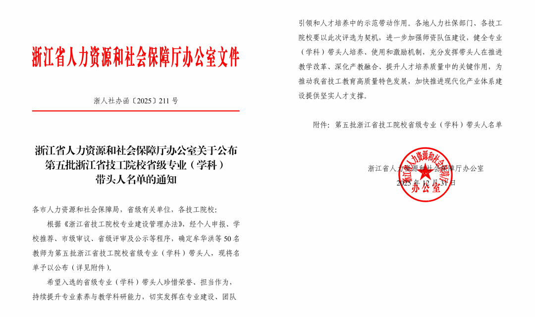 近日,浙江省人力资源和社会保障厅公布第五批浙江省技工院校省级专业(学科)带头人名单,我院王华飞老师入选建筑类(建筑施工)专业带头人、徐政老师入选文化艺术类(环境艺术设计)专业带头人。