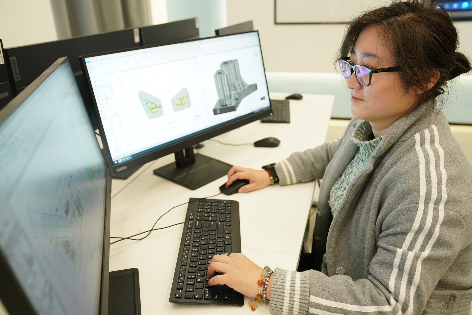 两块显示屏前,来自浙江建设技师学院的张吉快速操作键盘,各种点、线、面令人眼花缭乱。右侧显示屏是数十张建筑平面图纸,左侧则是张吉“画”的立体建筑模型……