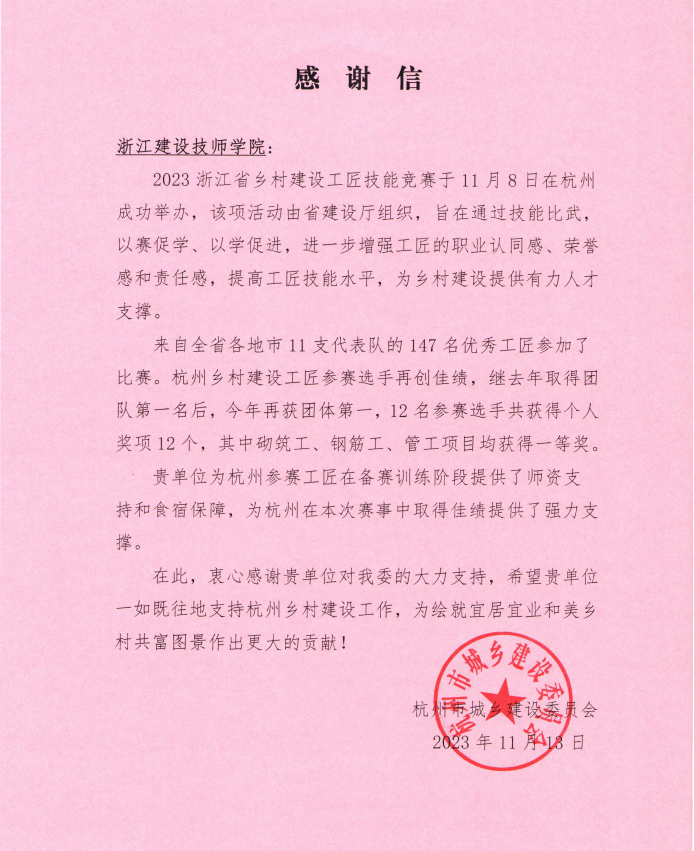 11月13日,杭州市城乡建设委员会向学院发来感谢信,感谢学院为杭州参赛工匠在备赛训练阶段提供师资支持和服务保障,为杭州在本次赛事中取得佳绩提供强力支撑。