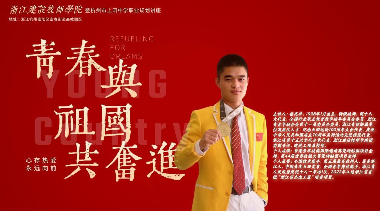 从一名农家子弟成长为世界技能大赛冠军,这是浙江建设技师学院青年教师崔兆举的奋斗故事。5月9日,第七党支部组织教师崔兆举作为特邀嘉宾在杭州上泗中学为学生们开展讲座,他围绕自身的成长经历,分别从选择、坚持、拼搏、追梦四个方面讲述自己的冠军故事,激励着更多青年学子走技能成才、技能报国之路。
