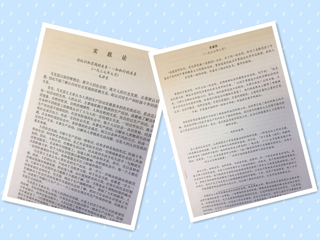 随后,参会人员学习了《实践论》、《矛盾论》等文件。会议认为,“两论”是毛泽东思想的哲学基础,是中国化马克思主义的重要哲学成果,也是我们学习哲学的入门内容和重要途径。时间已经过去了80年,但历史的年轮并没有磨灭“两论”的理论光辉,习近平总书记系列重要讲话精神和治国理政的新理念新思想新战略正是“两论”在当代的发展和运用。