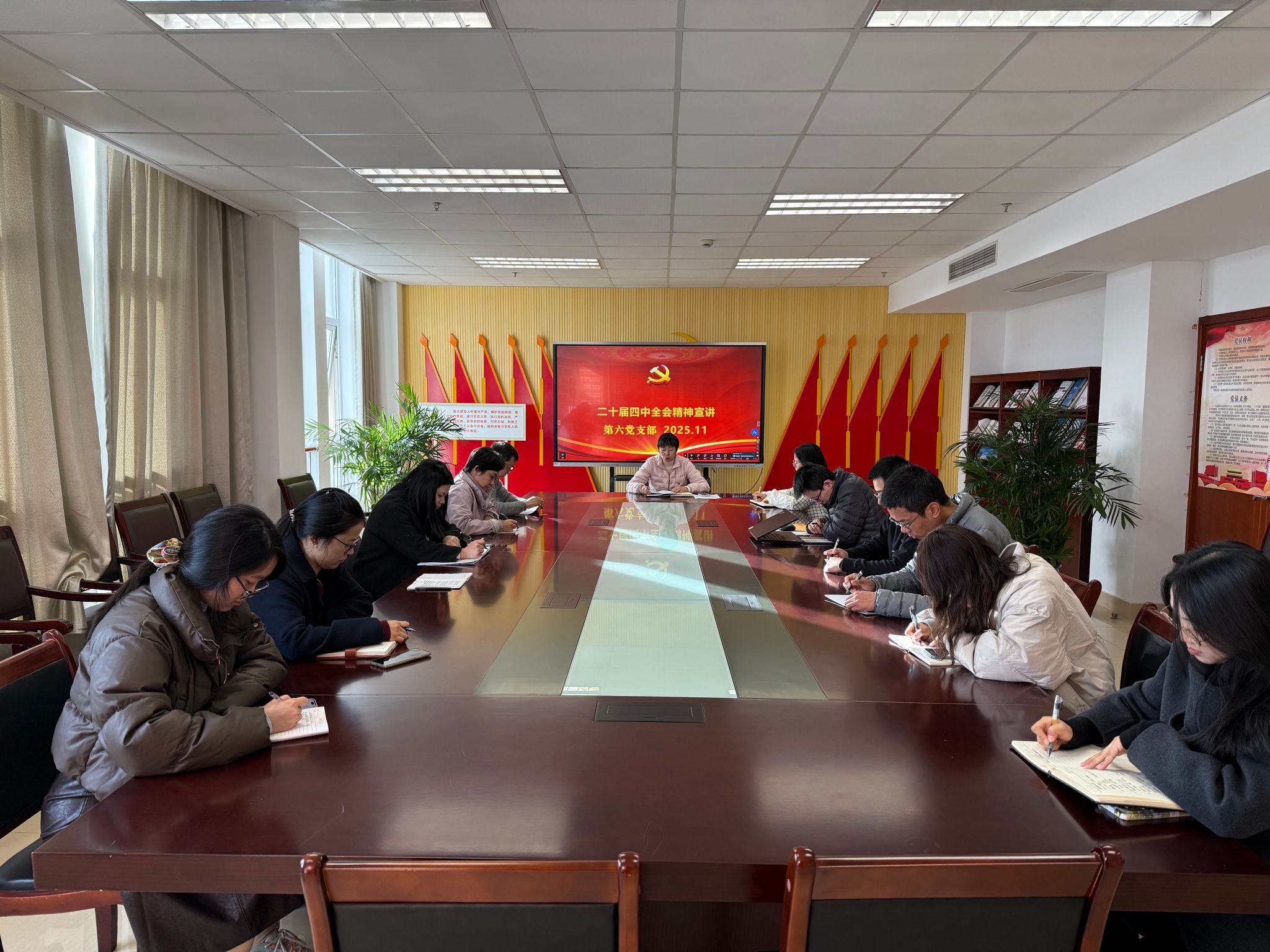 为深入学习贯彻党的二十届四中全会精神,切实把支部党员思想和行动统一到党中央决策部署上来,11月26日,学院第六党支部在911会议室召开专题学习会,以“深悟全会精神 扛起奋进新使命”为主题开展集中学习研讨,支部党员参加会议。