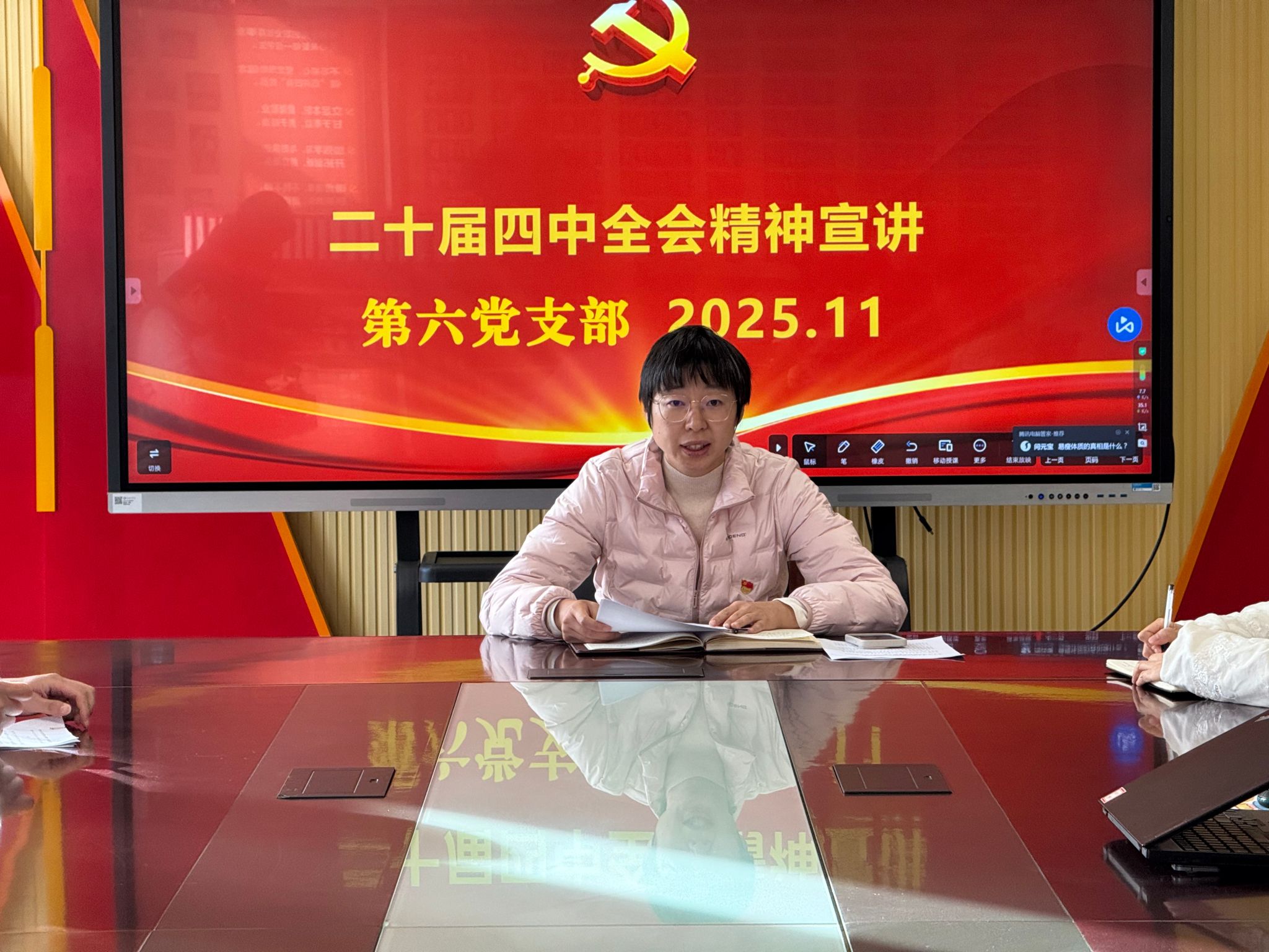会上,支部书记胡海瑛围绕全会精神从“怎么看、怎么悟、怎么干”三个维度带领支部党员展开深入学习。在“怎么看”环节,重点解读了全会的核心要义、目标要求和关键举措。在“怎么悟”环节,结合支部工作实际,全面总结了支部的整体工作情况,并分析支部工作存在的问题和下一步整改方向。