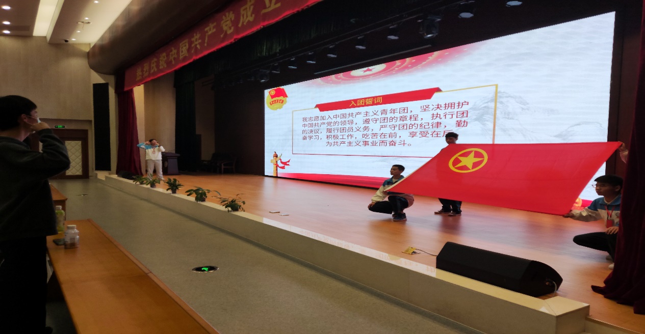 在正式观影前,全体肃立,耳边响起庄严的中华人民共和国国歌。奏唱完国歌后团歌响起,在“光荣啊,中国共青团”的歌声中,全体团员代表面向团旗,坚定地举起自己的右拳,群情激昂的重温了入团誓词,再次回想起入团那一刻的心潮澎湃,将责任意识深深的刻在心里。
