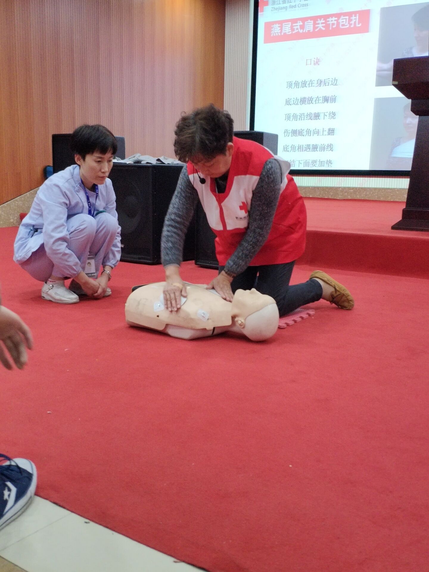 本次培训分理论和实操两大模块。在理论培训中,富阳红十字会的钟老师向志愿者们讲解了在突发情况下的现场急救:如何给生命垂危的人做心肺复苏,排除气道异物梗阻、AED和自救自护等基本理论知识。钟老师具有丰富的急救经验,枯燥的理论在她的讲解下,生动形象,浅显易懂,让我们的救护小白们听的津津有味。