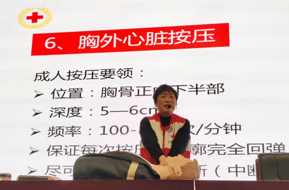 这次讲座邀请到浙江省红十字会的一级讲师赵筱藜副主任护师。经验丰富的赵老师,在这次培训中,不仅有详实的理论讲解,而且调动学员利用身边有限的资源充分动手,在沙发座位靠背上模拟心脏按压,邀请大家齐声朗诵急救关键步骤加深印象,还抛出问题让同学们探讨思考……,激发同学们热情参与。