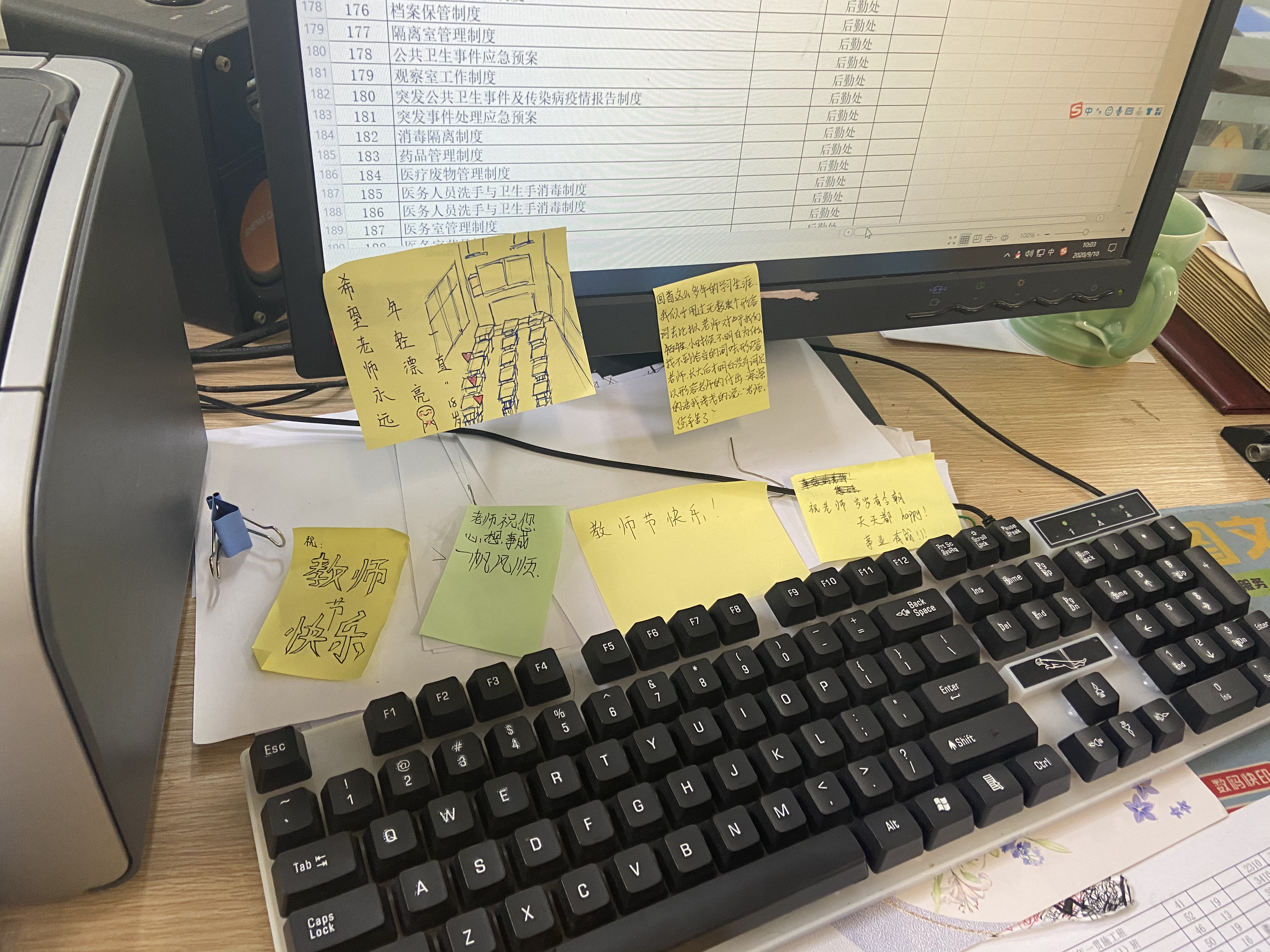 中午,当老师们回到办公室,发现自己的办公桌早已被同学们深深的感恩情“占领”,一张张便利贴上写满了对老师的祝福“老师节日快乐,祝您工作顺利,天天开心”“老师祝您永远18岁”……