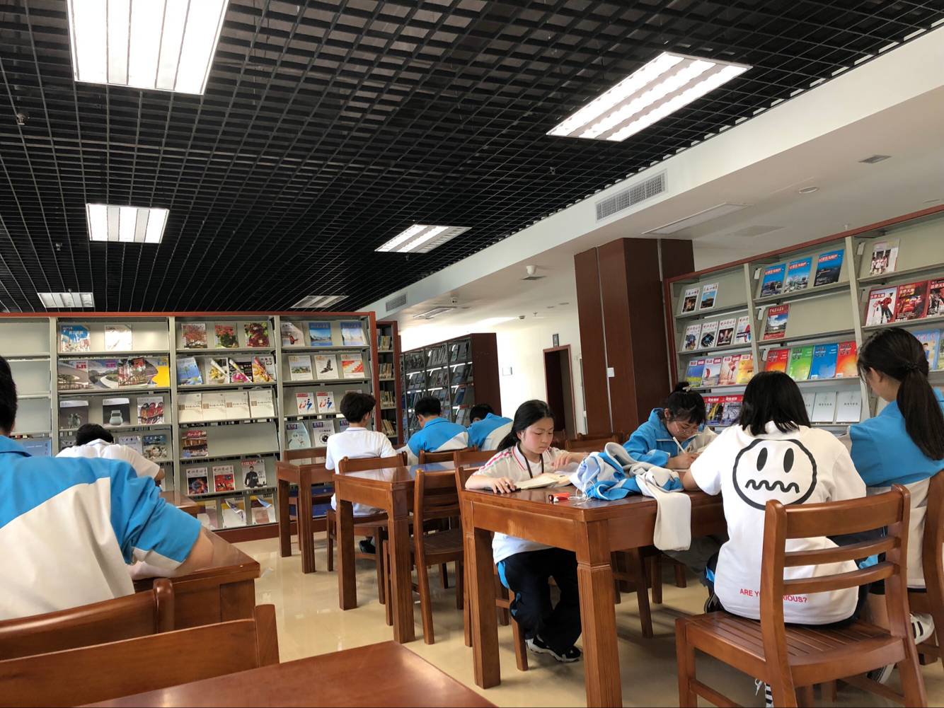 看,书香濡染,芬芳图书馆。忙里偷闲的同学们正在阅览室汲取英文世界的精神食粮。同学们的生命在书香的世界里,变的愈加醇厚耐品,心灵世界充满了诗意,思考问题时充盈着丰沛的智慧和哲理。捧着书本精心阅读的同学们,为你们点赞。