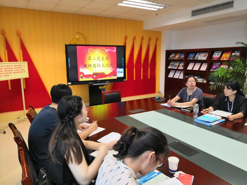 为了更好的把主题教育和实际工作相结合,为了进一步促进支部内教师的教学交流,以达到合力研讨各科教学中的新问题,提高教学质量,于6月21日下午在行政楼911举行了第二党支部的教师岗位大比武。本次活动主要展示了李丹和方震老师的说课程以及新教师石小玉和徐灵德的说课,参加“大比武”的老师们都为这次活动做了充足的准备,经历了集体备课,多次试讲磨课,多次修改教学设计,多次总结和反思,最终呈现了一节又一节的精彩课堂。