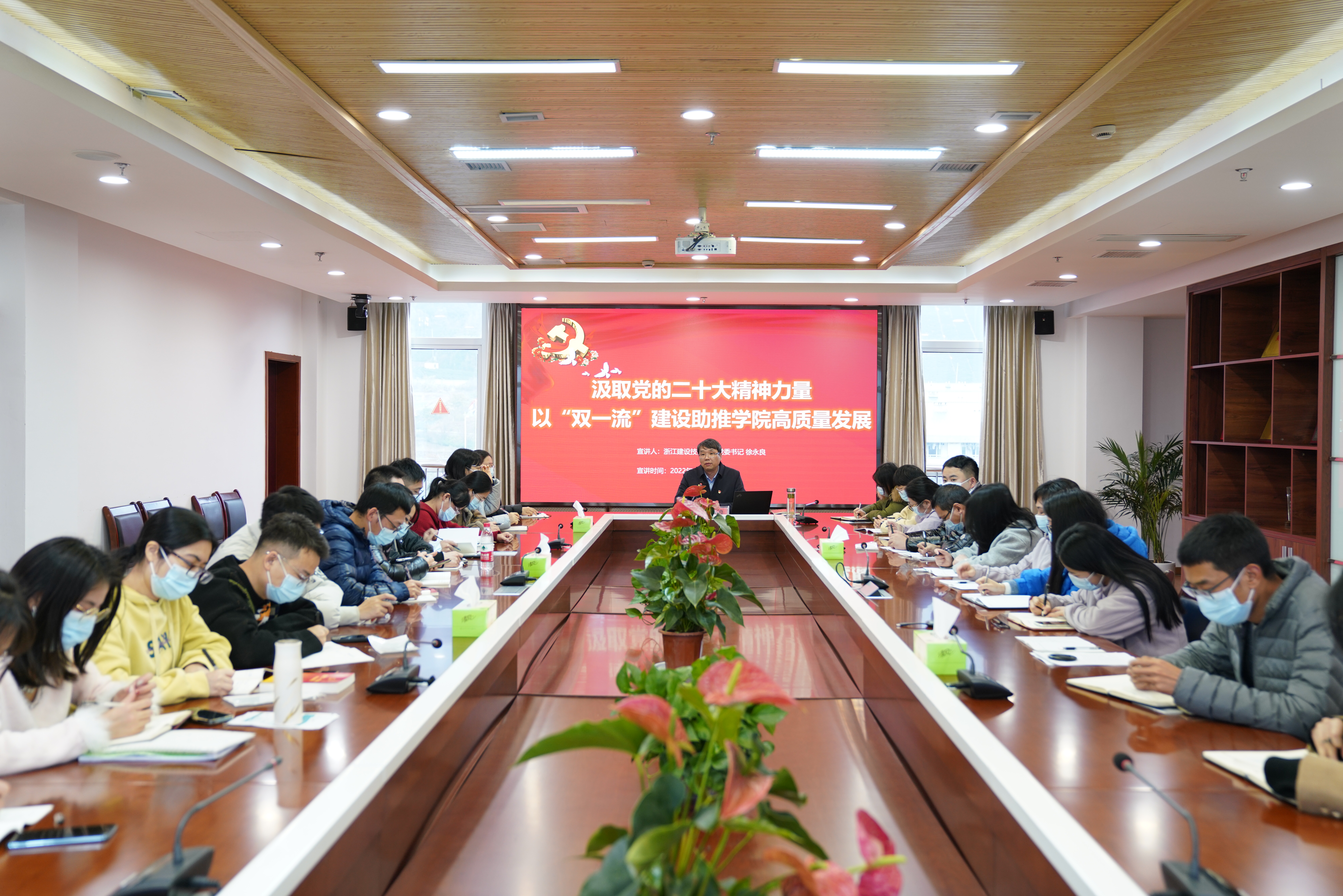 党的二十大是在全党全国各族人民迈上全面建设社会主义现代化国家新征程、向第二个百年奋斗目标进军的关键时刻召开的一次十分重要的大会。学习宣传贯彻好党的二十大精神是学院当前和今后一个时期首要政治任务,学院各党支部和全体党员深学细悟党的二十大精神的核心要义、丰富内涵、实践要求,认真领悟党的二十大提出的中心任务和战略部署,深刻把握习近平新时代中国特色社会主义思想的世界观和方法论,持续激发忠实践行“八八战略”、坚决做到“两个维护”、奋力推进“两个先行”、建设一流技师学院的强大动力,扎实推动党的二十大精神在学院落地生根、开花结果。
