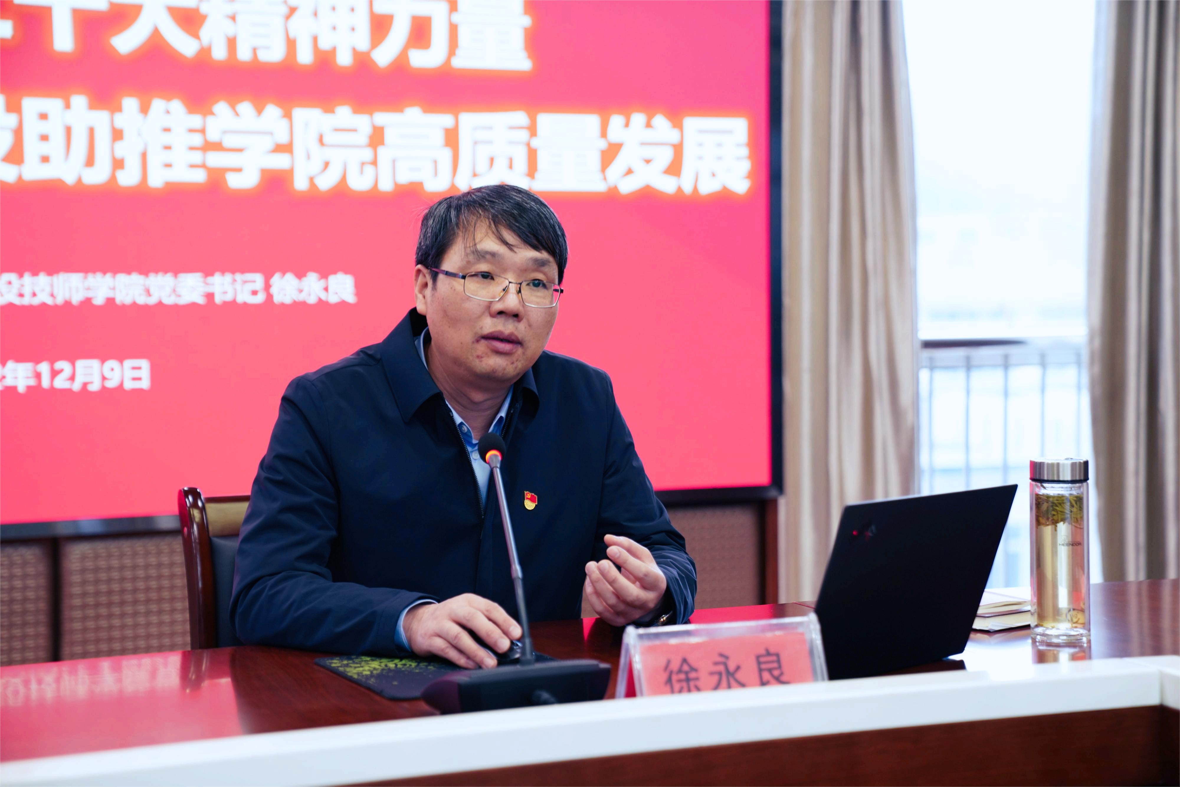 活动中,党委书记徐永良以“汲取党的二十大精神力量 以‘双一流’建设助推学院高质量发展”为题,阐述了十九大以来的历史成就和二十大的历史背景,并结合学校实际情况,重点解读了报告中关于教育工作的论述,引领党员干部将二十大报告中的新观点、新论断、新思想付诸行动,见之于成效。