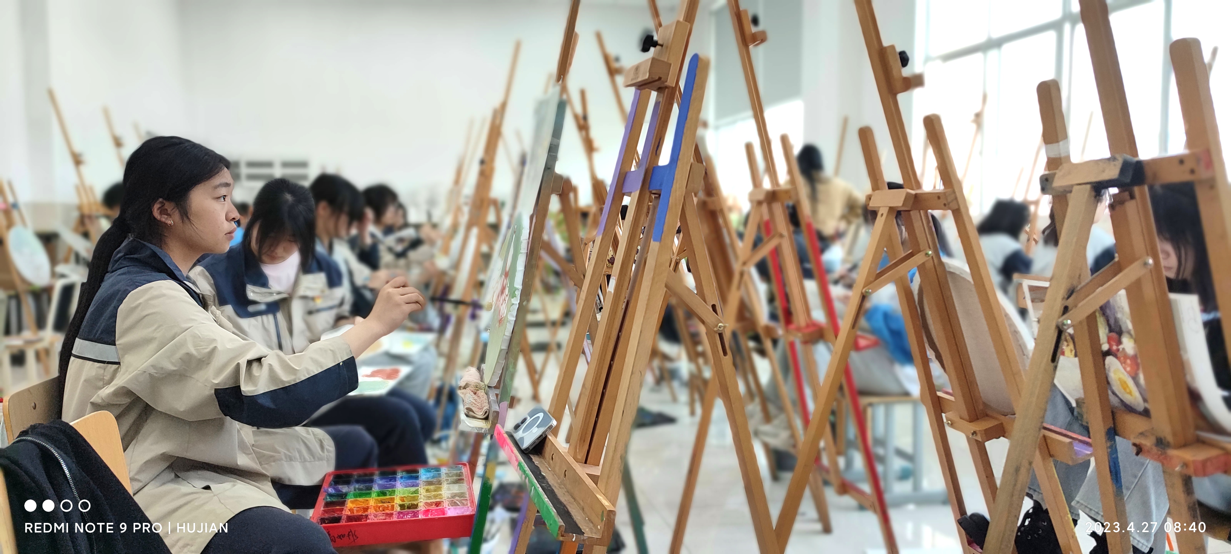 在学院建筑装饰职业训练院品宏涂装项目管理技师研修基地,创意涂装项目的比拼正在火热进行中。同学们正聚精会神地使用细绳、石英砂、颜料,在画板上天马星空的创作,不一会,作品的大致模样就呈现在了面前。