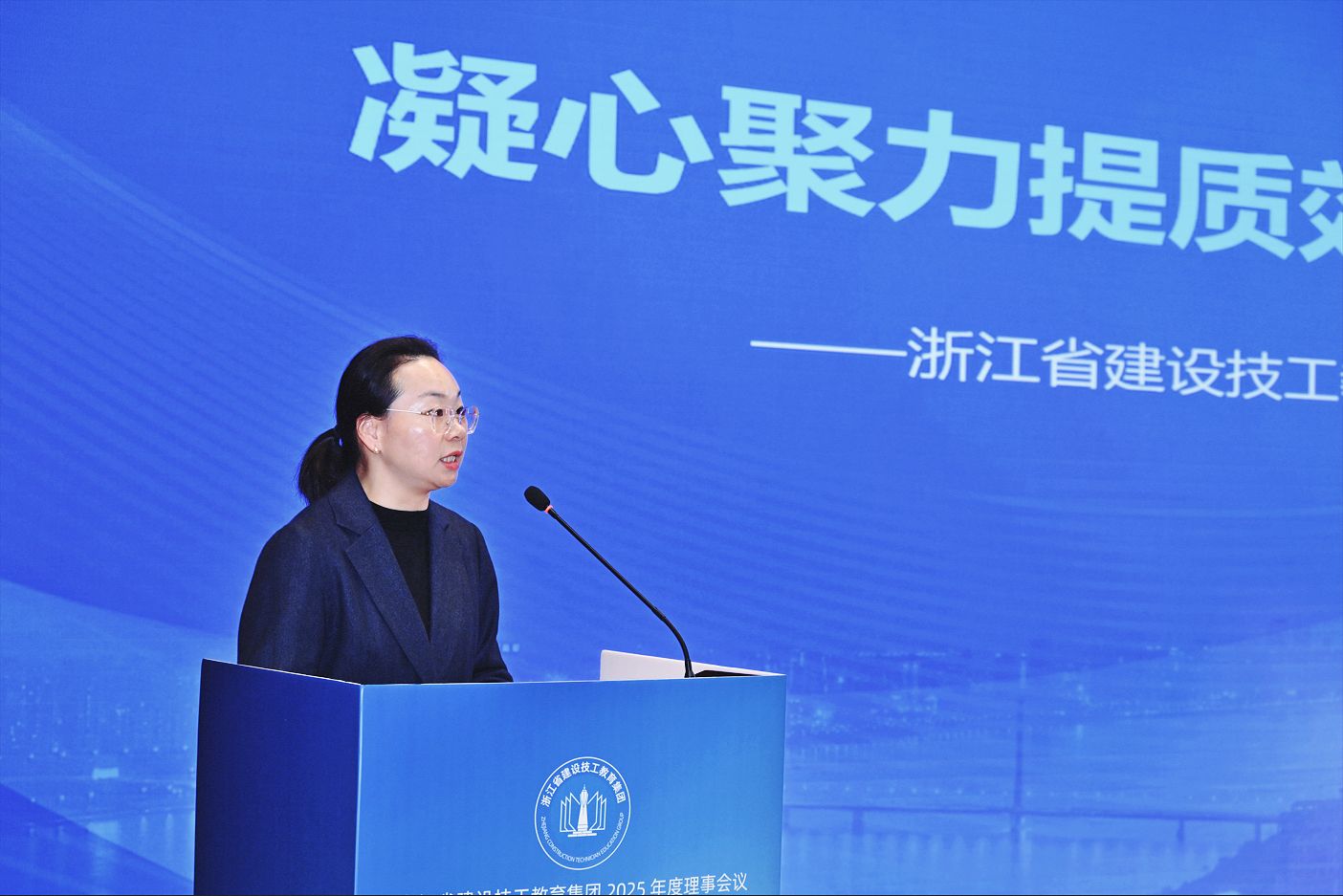 集团理事长、浙江建设技师学院院长毛文娟代表集团牵头单位——浙江建设技师学院,向长期以来关心支持集团发展的行业企业、兄弟院校及社会各界朋友,致以最诚挚的感谢,并以“凝心聚力启新程 踔厉奋发创未来”向大会作《浙江省建设技工教育集团2025年度工作报告》。报告围绕“145”发展路径,系统总结了过去一年集团在平台建设、人才培养、社会服务、国际合作等方面取得的成果,分析了集团面临的机遇与挑战,同时以锚定“五大突破”为目标,对下一阶段深化党建与业务融合、实质化运作产教融合体、服务国家战略与区域发展等重点工作进行了规划与部署。